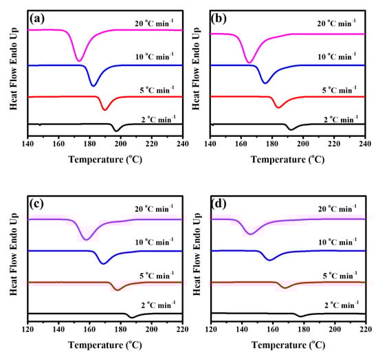Figure 6 displays nonisothermal DSC curves of PBT-co-PTMEG copolymers in a temperature range from 50 to 240 °C under 2, 5, 10, and 20 °C min−1. The exothermic peak becomes more extensive than the PBT and shifts to a lower temperature as the cooling rate increases, demonstrating that the motion of the molecular chains is not fast enough to attain thermal equilibrium under a high cooling rate []. Besides, an exothermic event as a shoulder of the peak on the higher temperature side was observed when PTMEG was added, implying a microphase separation of PBT-rich and PTMEG-rich phases. With the temperature decreased, the PBT-rich phase crystallized at a higher temperature range, and PTMEG-rich phases crystallized successively at a lower temperature, resulting in a “shoulder” shape with a peak, especially at a higher cooling rate.