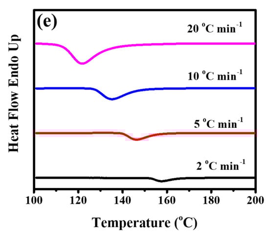 DSC curves of PBT-co-PTMEG copolymers in cooling process at 2, 5, 10, and 20 °C min−1: (a) PBT, (b) PBT-co-PTMEG-10, (c) PBT-co-PTMEG-20, (d) PBT-co-PTMEG-30, and (e) PBT-co-PTMEG-40.