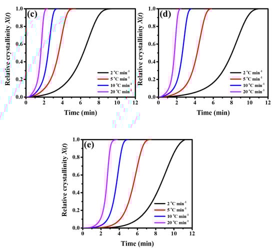 where Xc(t) and Xc(t∞) are the heat generated at time t and infinite time t∞, respectively, and dH(t)/dt is the rate of heat flow, which means that dH(t) is the enthalpy of crystallization at a given temperature during the time interval dt via DSC measurement. The relative crystallinity fraction X(t) as a function of time was calculated. The result is shown in Figure 7.