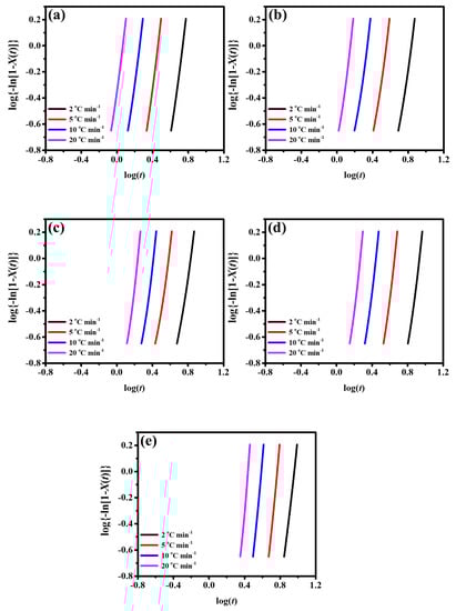 The curve of log{–ln[1–X(t)]} versus log t at the X(t) in a range from 20 to 80% was obtained, as presented in Figure 8. The Avrami exponent n and the crystallization rate constant k were obtained from the slope and the intercept of the curve. The half-time and growth rate were also obtained using the following equation: