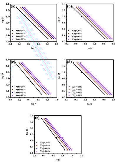 Curves of log ∅ versus log t for PBT-co-PTMEG copolymers: (a) PBT, (b) PBT-co-PTMEG-10, (c) PBT-co-PTMEG-20, (d) PBT-co-PTMEG-30, and (e) PBT-co-PTMEG-40.