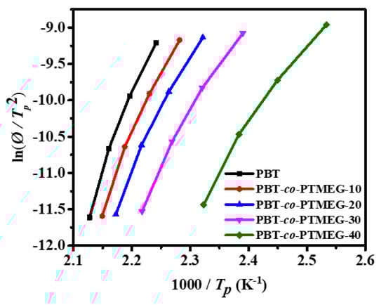 where ΔE is the activation energy, Tp is the peak temperature of crystallization, and R is the universal gas constant. The curves of ln(∅/Tp2) versus 1000/Tp are displayed in Figure 10, and the value of ΔE was issued from the slope. The ΔE was detected at the lowest value for neat PBT and increased with the PTMEG ratios (−173.04, −150.05, −134.38, −117.05, and −96.64 kJ for PBT, PBT-co-PTMEG-10, PBT-co-PTMEG-20, PBT-co-PTMEG-30, and PBT-co-PTMEG-40, respectively). This demonstrates that the incorporation of PTMEG into PBT enhanced the energy barrier of copolymers, revealing a reduction in the crystallization rate due to the irregular chain. This result agrees well with the trend observed previously by Avrami and Mo’s model.