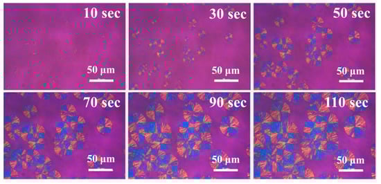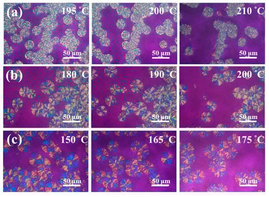 Theoretically, a low temperature is favorable for nucleation; however, the mobility of the molecular chain was more restricted, which causes relatively concentrated spherulites with a low growth rate. By contrast, at high temperatures, the nucleation becomes more unstable and vulnerable due to the movement of the molecular chain to increase drastically; only small and few spherulites were formed. In summary, the highest spherulitic growth rate can be acquired only at a temperature range favoring both nucleation and crystal growth []; between these two extremes, the growth rate passes through a maximum where the two factors are approximately equal in magnitude [].