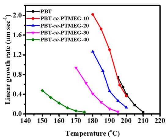 However, the observation of spherulitic growth rate isothermally at all temperatures is difficult due to the high crystalline speed of PBT-co-PTMEG copolymers, and the spherulite overgrows during the cooling process. Therefore, only the process at higher temperatures was surveyed completely. Taking PBT-co-PTMEG-40 as an example, the spherulitic growth process under a specific temperature (160 °C) at a different time is displayed in Figure 12. The growth rate of spherulites (G) can be obtained by recording the variation in the spherulitic dimension.