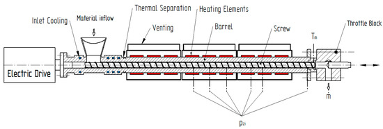 Experimental studies were performed on a 35 mm SML single-screw extruder (SML, Lenzing, Austria). A schematic of the test setup is shown in Figure 2. The electrical drive unit provided a maximum mechanical power of 38.4 kW and a maximum screw speed of 434 rpm. At the extruder head, a throttle block equipped with an adjustable screw was installed to set the discharge pressure.