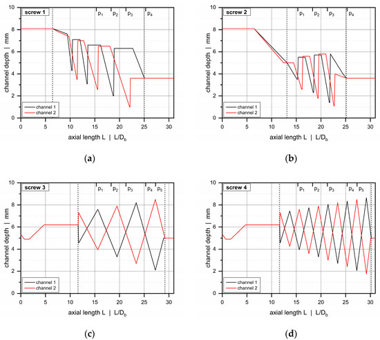 For each barrel, we investigated two double-wave screws of outer diameter DS = 34.85 mm and axial length L = 1090 mm. In total, these involved two screws (screws 1 and 2) for the smooth-bore and two screws (screws 3 and 4) for the grooved-barrel configurations. To adapt the screw designs to the diverse conveying characteristics of conventional and feed-controlled extrusion processes, different screw geometries were used in each case. For each barrel system, however, the screws were identical except for the geometry of the wave zone. Figure 3 illustrates the channel-depth profiles of the screws.