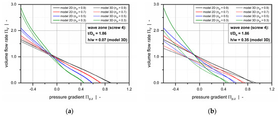 The two-dimensional melt-conveying model has three independent dimensionless input parameters: (i) the screw pitch ratio , (ii) the power-law index , and (iii) a dimensionless pressure gradient . Taking the influence of the screw flights into account, the three-dimensional model additionally requires (iv) the aspect ratio of the screw channel h/w to be predefined. A comparison of the models is shown in Figure 6, which illustrates two- and three-dimensional screw characteristic curves for the wave zone of screw 4 (with t/Db = 1.86) and various power-law indices. To illustrate the effect of the screw flights on the flow, the aspect ratio in the three-dimensional model was set to h/w = 0.07 and h/w = 0.35, representing the screw channels at a peak and a valley, respectively.