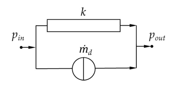 The main idea of our semi-numerical approach is as follows: To simplify the complex flow in wave-dispersion zones, the screw channel is subdivided into very small segments with constant geometrical and physical parameters. These sections are indicated by network elements, each of which consists of a source and a resistance connected in parallel that represent the local drag and pressure flows, respectively. With these properties, the network elements are designed to describe the local output-pressure gradient relationship. Figure 7 illustrates the basic structure of a network element, where is the drag flow, k the conductance, and and are the pressures at the surrounding nodes.