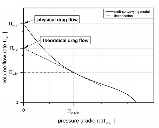 In Part A [34], we linearized a nonlinear die-flow equation for power-law fluids to determine the properties (theoretical drag flow and conductance) of each network element. The modeling approach presented here considers the nonlinear conveying behavior of the wave channel by linearizing our melt-conveying models and with respect to the current operating point. For both models, (theoretical) drag flow and conductance are obtained from the initial value and the slope of the linearization, respectively (Figure 8).
