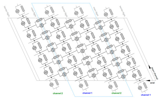 In the subsequent step, linearized element properties were derived ( and ), and the network equations for each element were built. The resulting system of linear equations was then solved, and the calculated pressure field was used to update the element flow rates for the next iteration. A simulation was considered converged if the pressure differences between the first and final nodes in each subchannel was smaller than bar between two iteration loops.