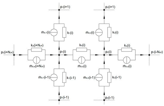 The equivalent circuit diagram for an arbitrary nodal point with index i is shown in Figure 10. The indices “1” and “2” describe the first and the second subchannel, while the indices “a” and “b” refer to the main and the barrier flight.