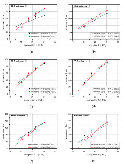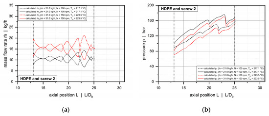 At the beginning of each test run, the discharge pressure was set to 250 bar for the HDPE and to 150 bar for the PP-R by changing the position of the screw mounted within the throttle block. These values represent characteristic settings found in pipe and film extrusion. The discharge pressure was adjusted once before each test at predefined screw speeds. During the experimental procedure, the position of the throttle screw was kept constant.