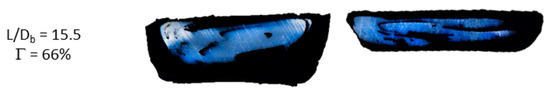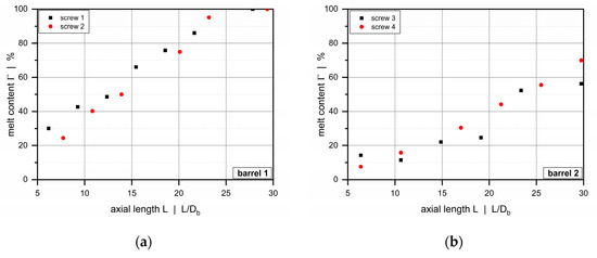 In addition, we carried out solidification experiments for selected processing conditions using the HDPE to analyze the melting behavior of the screws. To this end, carbon black masterbatch was added to the white polymeric material, the extrusion process was run in stationary mode and then stopped abruptly, cooling down the extruder and thus solidifying the polymer melt. After pulling the screw from the processing unit, thin sections of the solidified material were removed from the helical ribbon. The solids and melt content along the wave zones were evaluated by image analysis. The white and black sections indicated solid material and polymer melt mixed with the masterbatch, respectively (Figure 4). Taking several samples from various axial positions, we assessed the melting progress by relating the area of the black spots to the total area of the cross section.