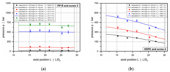 For each screw-barrel configuration and material, experiments were performed by increasing the screw speed from 25 rpm up to 400 rpm. Due to mechanical limitations of the barrels, we were not able to reach the maximum screw speed in all experimental setups. With the single-screw extruder operating at steady state, the throughput, the axial pressure profile, and the melt temperature were measured using a data acquisition unit. For each operating point, the processing parameters were recorded for one minute. Mean and standard deviation were evaluated to determine parameter fluctuations and the stability of the process. Table A1 in the Appendix A summarizes the experimental data for each operating point.