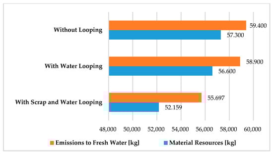 Figure 1 shows the values of material resources and emissions to freshwater for the three examined scenarios in the production stage. Material resources and emissions to freshwater are larger compared to other flows; therefore, these parameters were illustrated. The percentages of these parameters are 48.56% for material resources and 50.33% for emissions to freshwater. The total value of the other emissions examined (energy resources, deposited goods, emissions to air, emissions to seawater, and emissions to agricultural and industrial soil) was 1.14% for the three scenarios examined. Therefore, these values are negligible and these flows are not shown in Figure 1.