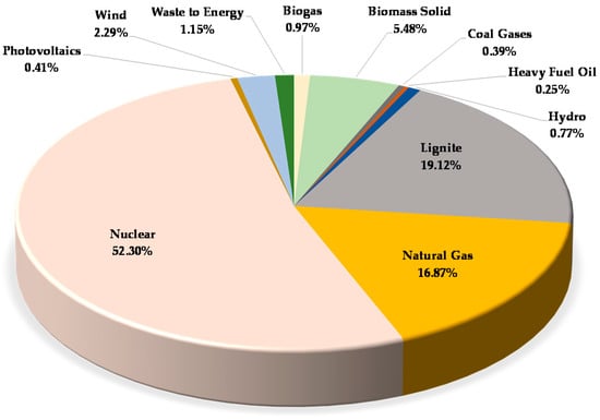 As electricity, we set up a domestic energy mix based on the latest statistical and applied LCA software database. There is no literature available on the Hungarian electricity grid mix yet, which is why we considered the importance of creating and illustrating it here with the help of a pie chart (Figure 2).