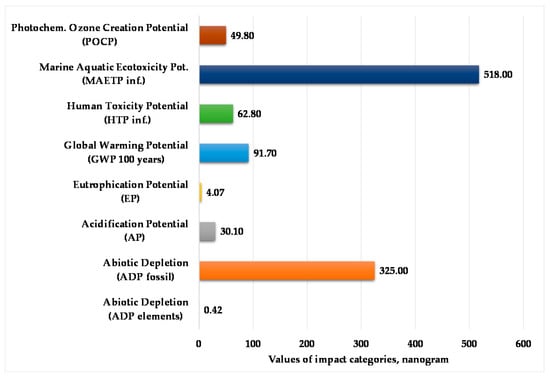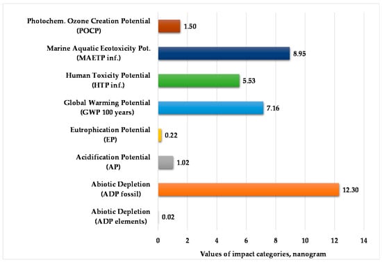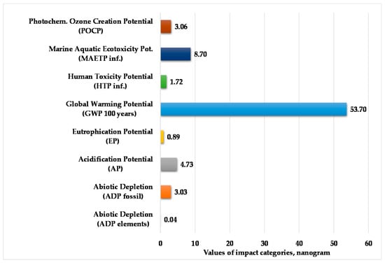 Figure 6 presents the normalized and weighted values for eight examined environmental impact categories during the use of the polypropylene product. The applied normalization and weighting methods were the same as in the production stage. marine aquatic ecotoxicity potential and abiotic depletion for fossil fuels are higher compared to other environmental impact categories, as in the previous phase. The values of abiotic depletion for elements and eutrophication potential are below 1 ng.