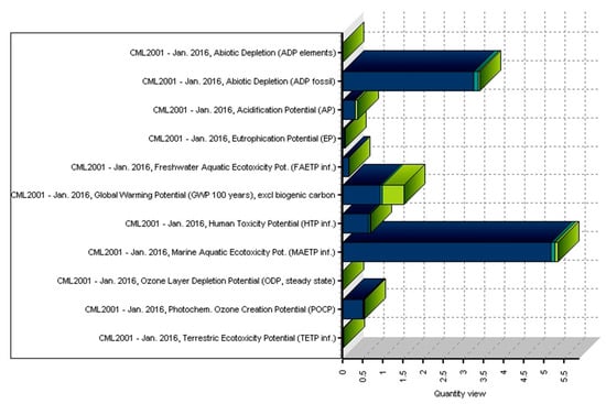 During the analysis, the reference system was the total inputs and outputs for the European Union. We used normalization and weighting for calculating the magnitude of the research results of impact category indicators. The applied normalization reference was environmental impacts for 28 European Union countries [27]. The weighting method was thinkstep LCIA Survey 2012 with CML 2016 (excl. biogenic carbon) in Europe. Eight environmental impacts—global warming, acidification, eutrophication, photochemical oxidant formation, human toxicity, abiotic depletion (fossil and elements), and marine aquatic ecotoxicity—were used for the research analysis. Public concern about climate change is an important consideration in modern society, and this environmental impact is measured through the global warming potential. The global warming potential value is for 100 years, excluding. biogenic carbon. The ecosystem protection is related to substances such as sulphur, nitrogen oxides, and phosphorous compounds, which are directly related to the acidification potential and eutrophication potential. The formation of tropospheric ozone threatens the environment and human health and it was considered in the photochemical ozone creation potential. Abiotic resource depletion is one of the most debated impact categories; see, for example, the guidelines of the International Reference Life Cycle Data System (ILCD) and the PEF (Product Environmental Footprint), in Europe [34,35,36]. Human toxicity potential describes the exposure to, and effects of, toxic substances. Guinée and Heijungs [37] decided to base the characterization model of abiotic resource depletion on physical data on reserves and annual deaccumulation. Oers et al., decided that the implementation of substitution options was not (or not yet) feasible within LCA [38]. Marine aquatic ecotoxicity refers to the impact of toxic substances emitted to marine aquatic ecosystems.