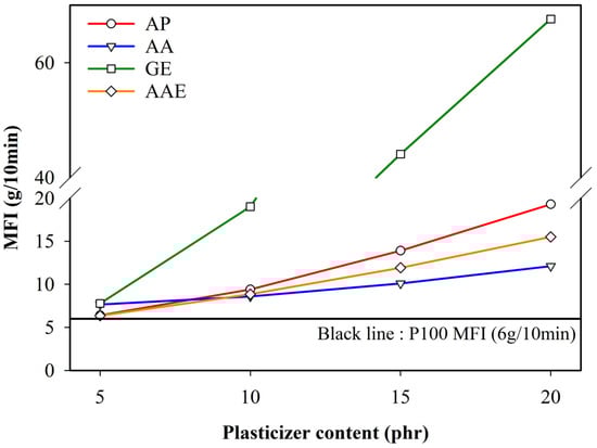 The flow behavior of melted polymers is important in polymer manufacture and processing, including the production of blown and cast films as well as foaming extrusion. The flow behavior of polymers is influenced by various factors, such as the temperature, molecular weight, molecular weight distribution, and addition of fillers and plasticizers [43,44]. The flow behavior can be evaluated by observing the MFI [45]. As a single point test, MFI is a remarkably sensitive technique for distinguishing a change in polymer additives. In the present study, MFI measurements were conducted to investigate the effects of plasticizers on the shear viscosity of PLA. Figure 1 shows the variation of MFI for the plasticized PLA samples with increasing plasticizer content. Evidently, the value of MFI increased with increasing plasticizer amount. It is noteworthy that glycerol ester also acted as a lubricant, which was demonstrated by a sharp increase in MFI (up to 67) compared to other plasticizers. In addition, the sharp increase in MFI could be ascribed to the decomposition of PLA as well as the incompatibility between PLA and the plasticizer. These results showed that glycerol ester was not an adequate plasticizer for the blown film process. Furthermore, an increase in the content of adipate, adipic acid, and adipic acid ester resulted in a gradual increase in the MFI values of the plasticizers. This result was attributed to the molecules permeating the intermolecular spaces between the PLA chains, increasing the mobility of the chain segment and facilitating the flow of PLA [46,47]. Thus, the materials could be effectively applied in blown film processes by controlling their content and type.