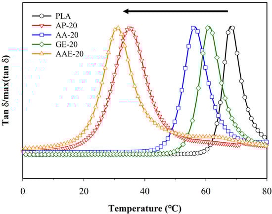 Variation of tanδ with temperature for neat PLA and PLA plasticized with varying plasticizer types and 20 phr.