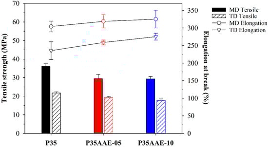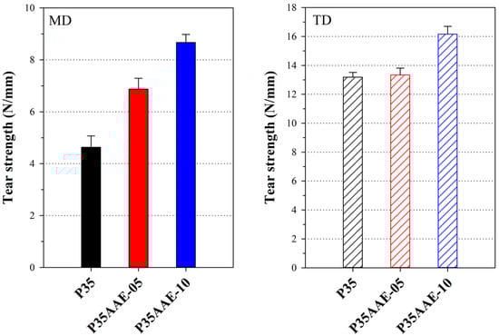 In a blown film process, the biaxial stretching in MD and TD occurs simultaneously, orienting the polymer chains of the blown film toward the plane of the film. In the present study, the blown films were quenched by cool air, which led to the crystallization and immobilization of the biaxial oriented chains [55,56]. Hence, the biaxial stretching and quenching processes could affect the mechanical properties, such as tensile strength and flexibility, as well as tear resistance. The changes in the tensile strength, elongation at break, and Young’s modulus of the PBAT blown film containing plasticized PLA are summarized in Figure 5 and Table 5. Overall, the tensile strength, elongation at break, and Young’s modulus in MD were higher than those in TD due to more oriented structures resulting from high stresses during the take-up winder process in MD. It is noteworthy that the tensile strength of the PBAT blown film containing plasticized PLA decreased with increasing content of the adipic acid ester plasticizer. In contrast, the elongation at break increased in both MD and TD. In particular, the tensile strength in MD decreased more than in TD. On the other hand, the change in the Young’s modulus showed a different tendency, i.e., it decreased in MD and increased in TD. These results could be attributed to reducing the intermolecular interactions as well as the increase in the chain mobility of PLA because, the orientations of the PLA structures were modified due to the permeation of the adipic acid ester plasticizer into the PLA chains. In addition, the different tendency in the Young’s modulus of MD and TD could be attributed to increase in the crystallinity. The Young’s modulus in high-oriented MD direction is decreased by restricting the orientation of the film, whereas the Young’s modulus in low-oriented TD direction is increased by increasing the crystallinity [57,58,59]. Consequently, the addition of the adipic acid ester plasticizer in the PLA/PBAT blown film affected lower tensile strength, higher elongation at break and the different tendency in the Young’s modulus of MD and TD.