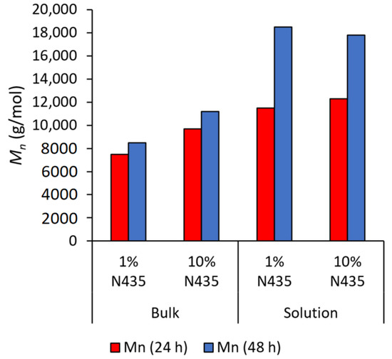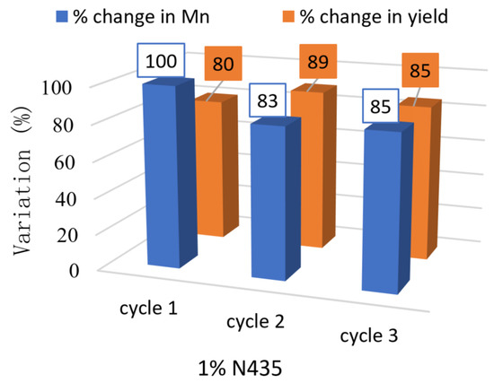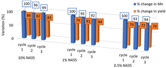 The recyclability of N435 was finally tested for three consecutive cycles in solution (1% w/w N435) (see Figure 5) and bulk conditions (0.5%, 1% and 10% w/w N435) (see Figure 6). The results for solution polycondensation showed ~17% drop in Mn during the second cycle from 12,100 to 10,000 g·mol−1; however, no significant changes were observed during the third cycle.