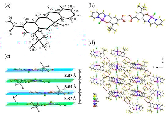 Complex 1 crystallizes in the triclinic space group and the asymmetric unit consists of one Cu(II) center, one HLsalpyca− monoanion and one Cl− anion. The Cu(II) center is tris-chelated by one HLsalpyca− monoanion through its phenolato, imino and pyridine groups and further coordinated by one Cl− anion, furnishing a distorted square-planar geometry (Figure 1a), with the Cu and the Cl away from the plane 0.24 and 1.11 Å, respectively. The carboxyl group of the HLsalpyca− ligand is protonated and non-coordinated. The Cu–Npyridine, Cu–Nimino, Cu–Ophenolato and Cu–Cl bond lengths are 1.9971(17), 1.9376(17), 1.8857(14) and 2.2299(6) Å, respectively and the Npyridine–Cu–Nimino and Nimino–Cu–Ophenolato bond angles are 82.98(7) and 92.00(6)°, respectively. Two [Cu(HLsalpyca)Cl] molecules form a hydrogen-bonded dimer through intermolecular hydrogen bonds (O3–H3∙∙∙O2#1, d(D∙∙∙A) = 2.637(2) Å, ∠(D–H∙∙∙A) = 168(3)°, #1 = −1−x, −y, −z) between two carboxyl groups of two HLsalpyca− ligands, with a graph set of (Figure 1b) []. In addition, there are also intermolecular π∙∙∙π interactions (plane∙∙∙plane: 3.37 and 3.69 Å) between any two neighboring [Cu(HLsalpyca)Cl] molecules that stack in a column manner along the crystallographic [010] direction, that is, b axis (Figure 1c). Moreover, there are also weak but significant intermolecular C–H∙∙∙Cl interactions (C9–H9B∙∙∙Cl2#2, d(D∙∙∙A) = 3.567(3) Å, ∠(D–H∙∙∙A) = 150°, #1 = −1 + x, y, z) between the chloro ligands and the methylene moieties of the HLsalpyca− ligands (Figure 1d).