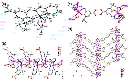 Crystal structure of 2: (a) ORTEP plot of the coordination environment around the Cu(II) center (30% probability ellipsoid). Weak Cu∙∙∙O semi-coordinations are shown as dashed lines. Symmetry code: #1, −x, y + 1/2, −z + 1/2. (b) View of the 1D zigzag chain structure. (c) Highlight the hydrogen-bonding pattern between two carboxyl groups of two HLsalpyca− ligands in two neighboring chains. (d) A 2D supramolecular wavy sheet supported by Ocarboxyl–H∙∙∙Ocarboxyl hydrogen bonds (dashed lines).