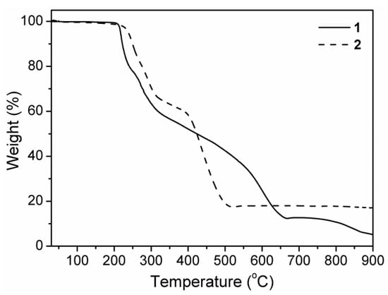 The thermogravimetric (TG) diagrams of 1 and 2.