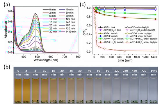 (a) Time-dependent UV/vis spectra of AO7 aqueous solution after the photocatalytic degradation by 2 and H2O2 under daylight. (b) Time-dependent photographs of AO7 aqueous solutions with the simultaneous existence of 2 and H2O2 under daylight. (c) Relative concentration of AO7 versus time under various degradation conditions: AO7 only in dark (▲); AO7 only under daylight (△); AO7 + H2O2 in dark (▼); AO7 + H2O2 under daylight (▽); AO7 + 1 in dark (◀); AO7 + 1 under daylight (◁); AO7 + 2 in dark (◆); AO7 + 2 under daylight (◇); AO7 + 1 + H2O2 in dark (■); AO7 + 1 + H2O2 under daylight (□); AO7 + 2 + H2O2 in dark (●); AO7 + 2 + H2O2 under daylight (○).