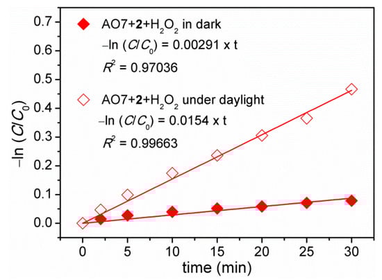 To gain a better understanding of the degradation kinetics of AO7 catalyzed by 2/H2O2, the experimental data were fitted by a first-order model as expressed by the following equation—ln (C/C0) = kt—where C0 and C are the initial and apparent concentration of AO7, respectively, k is the kinetic rate constant and t is time. As a result, the k values are determined to be 0.00291 min−1 and 0.0154 min−1 for degradation of AO7 in dark conditions and under daylight (Figure 6), respectively, within 30 min. Clearly, the rate constant of AO7 degradation under daylight is about five times larger than that in dark conditions, supporting again a photocatalytic degradation of AO7. Further, there exists the first-order exponential decay relationships between the concentration of AO7 (ppm) and degradation time (min), with the formulae of [AO7] = 3.97 × exp(−t/219.85) + 15.36 (R2 = 0.93874) in dark conditions and [AO7] = 19.52 × exp(−t/48.37) + 0.94 (R2 = 0.98367) under daylight (Figure S7).
