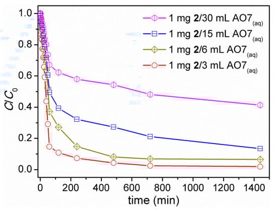 In terms of controls, several different concentrations of 2 have been conducted to check the required concentration that shows significant photocatalytic degradation activity (Figure S8). As decreasing concentration of 2, the degradation performance decreased but still in significant extents (Figure 7). For all tested concentrations (1 mg 2 dipped into 3, 6, 15, 30 mL AO7(aq)), the photocatalytic degradation performances of AO7 are quickly increased to 33–85% within 60-min irradiation and then gradually reach to approximately 59–98% as increasing irradiation time to 1440 min. These results clearly indicated that 2 exhibits good photocatalytic activity to degrade AO7 in the presence of H2O2 under daylight, even in a concentration as low as 1 mg 2/30 mL AO7(aq).