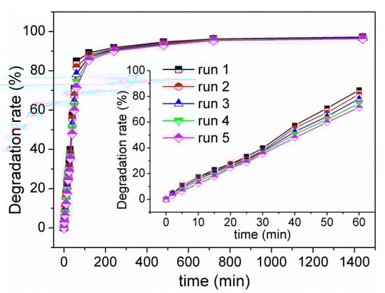 Photocatalytic degradation rates for multiple cycles for AO7 dye by 2/H2O2 under daylight. Inset: Highlight the photocatalytic degradation rates within 60 min.