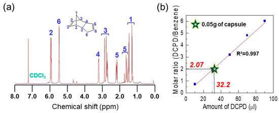(a) 1H-NMR spectrum of the extracted dicyclopentadiene (DCPD). (b) The calibration line of the DCPD/benzene molar ratio with function of the known volume of DCPD (10, 30, 50, 70, 90 µL). The solid line represents the result of a least squared linear fit with R2 = 0.997. Star-shaped mark represents the DCPD/benzene molar ratio value measured from 0.05 g of mechanically-enhanced microcapsules and corresponding amount of DCPD.