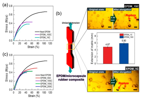 (a) The stress–strain curves of neat EPDM rubber, the EPDM/microcapsule rubber composites with 10 wt% of mechanically-enhanced UF microcapsules (EPDM_10SC), and the EPDM/microcapsule rubber composites with 10 wt% of conventionally prepared UF microcapsules (EPDM_10C). (b) The required extension value of the EPDM/microcapsule rubber composites to break two capsules in the composite (scale bars: 200 µm). (c) The stress-strain curves of the EPDM/microcapsule rubber composites with varied mechanically-enhanced UF microcapsule contents.