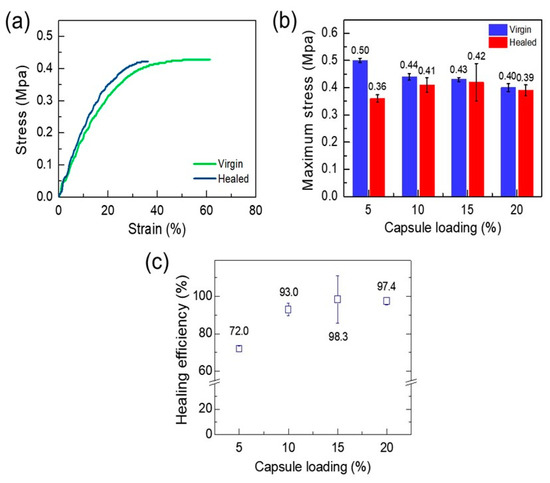 (a) Stress–strain curves of the virgin and the healed EPDM/microcapsule rubber composites with 15 wt% of the mechanically-enhanced UF microcapsules. (b) The maximum stress values of the virgin and the healed EPDM/microcapsule rubber composites. (c) The self-healing efficiencies of the EPDM/microcapsule rubber composites with different amounts of the mechanically-enhanced UF microcapsules.