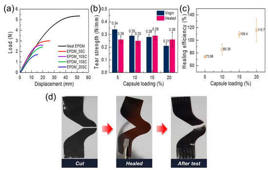 (a) Load-displacement curves of the EPDM/microcapsule rubber composites with varied amounts of the mechanically-enhanced UF microcapsules. (b) The tear strength values of the virgin and the healed EPDM/microcapsule rubber composites with varied amounts of mechanically-enhanced UF microcapsules. (c) The self-healing efficiencies of the EPDM/microcapsule rubber composites with varied amounts of mechanically-enhanced UF microcapsules based on the recovery of the tear strength. (d) The photo images of the cut and the healed EPDM_15SC, and the photo image of the EPDM_15SC torn by the tear test after the healing.