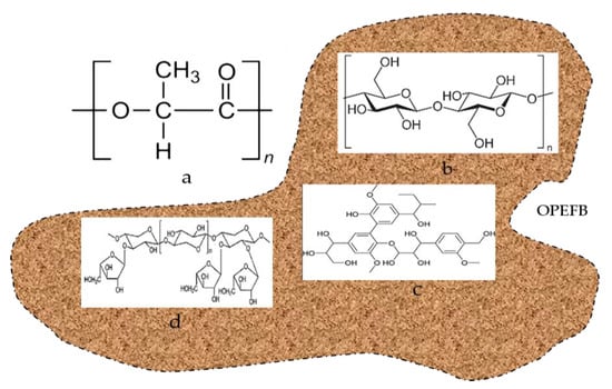 Chemical structure of (a) polylactic acid (PLA) and chemical structure of oil palm empty fruit bunch (OPEFB) fiber content include (b) cellulose, (c) hemicelluloses, and (d) lignin.