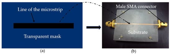 The proceedings to prepare a microstrip transmission line utilized in this study are depicted in Figure 2a,b. The microstrip fabricated using the RT-Duriod 5880 as a substrate has complex permittivity (2.2-j*0.00088), aluminum, connectors, and a transparent plastic sheet. The transparent mask was carried out by the Auto CAD2001 software)Portland, OR, USA( in conjunction with a high-resolution laser printer (HP LaserJet 1200, Hewlett-Packard, CA, USA) to help transfer the initial figure to the real figure of the sensor []. The substrate was thoroughly cleaned from dust, grease, and particles, or the contaminants were removed by rinsing and drying. The substrate had a dimension of 60 mm × 50 mm and a thickness of 0.7874 mm, while the transmission line had a length of 60 mm, width of 1.5 mm, and a characteristic impedance of >50 Ω. The transmission line, as shown in Figure 2a, was placed on the surface of the substrate, covering it with a piece of cloth, then pressed using a hot iron all over the substrate. Etching was achieved by immersing the board in the solution prepared by adding 1 kg of ferric chloride (FeCl3) to a liter of water. The etching process time can be shortened by heating the solution to 50 °C. The purpose of etching is to remove the unwanted part of the metal (copper), leaving only the designed circuit. Next, the substrate was placed on an aluminum slab, giving it a strong and firm grip, as shown in Figure 2b. SMA (Sub-miniature) is then attached to both ends of the duroid. The attachment was done by fixating screws after drilling holes by the side of the duroid. Care is taken to ensure that the inner conductor of the SMA is placed in contact with the line of the microstrip. The measurement of scattering parameter using the fabricated microstrip was achieved by placing the sample flat on the surface of the microstrip avoiding any air gap between the sample and the microstrip transmission line.