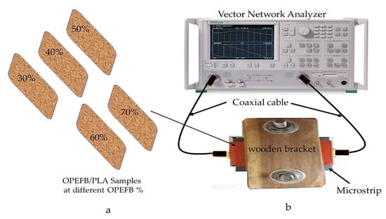 Measurement of scattering parameters S11 and S21 for each of the air (without sample) and OPEFB/PLA composites at different percentages of OPEFB was performed by a microstrip transmission line, Figure 4a,b, using the Agilent N5230A PNA-L network analyzer system (Agilent Technologies, Inc., CA, USA) with a commercial measurement (Agilent 85701B, CA, USA) software package [], at a frequency range from 0.20 to 12 GHz. Measurement of scattering parameters using the fabricated microstrip transmission line was achieved by placing the OPEFB/PLA samples flat, as shown in Figure 4a, on the surface of the microstrip. To avoid the influence of an air gap during the measurement, a wooden bracket was used to apply uniform pressure on the sample, as shown in Figure 4b. The vector network analyzer (VNA) was calibrated by implementing Electronic Calibration modules (N4691-60004) and the accuracy of the VNA depends on the quality of the calibration standards.