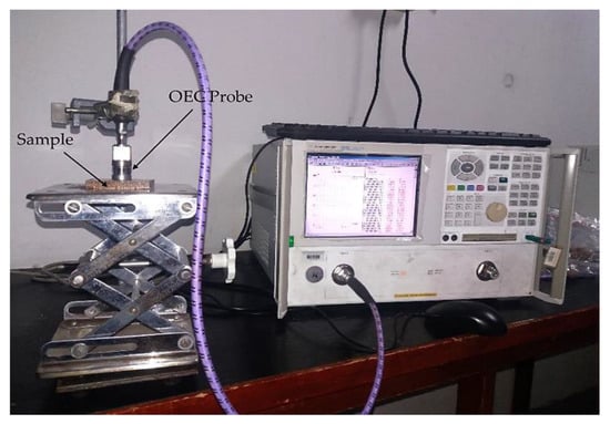 The complex permittivity (dielectric constant and loss factor) of the OPEFB/PLA composites at different percentages of OPEFB filler was measured via the open-ended coaxial probe (OEC) in conjunction with an Agilent N5227A Network Analyzer (Agilent Technologies, Inc. Santa Clara, CA, USA) and commercial measurement software (Agilent 85070B, Agilent Technologies, Inc., Santa Clara, CA, USA), as shown in Figure 5. The complete Agilent measurement kit consists of an Agilent 85070B sensor probe, a mounting bracket, a cable, a 3.5-inch high density shorting block for calibration, adapters, and software for data collection and plotting. The stages of the open-ended coaxial technique calibration used were the open standard air, a short circuit, and distilled water. After complete calibration, Polytetrafluoroethylene (PTFE) was used as the standard material to confirm the calibration before the commencement of measurements of the substrate. The measurement of permittivity is based on the interaction of the external electric field with the electric dipole moment and charges of the materials. When an electric field is applied to a dielectric material, three types of effects occur. The first type is energy reflection, the second type is energy absorbance, and the last type is surface transmittance. These effect types help indicate the material’s electrical properties involved in relative permittivity. Complex permittivity () measures the effect of the material on the electric field []. The mathematical expression of complex permittivity is given by the following equation: