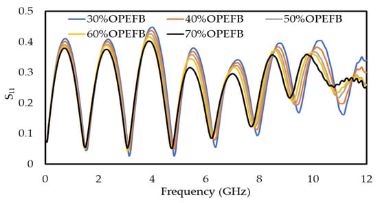 Variation of reflection (S11) for OPEFB/PLA composite at different percentages of OPEFB.