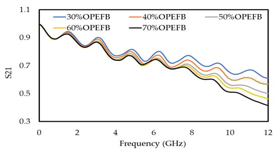 Composites with good properties can be obtained when the filler is well dispersed in the matrix. Moreover, the filler and the matrix should be compatible [], thus the filler (OPEFB) helps to control the general properties of the OPEFB/PLA composites. The effects of OPEFB loading on the S11 and S21 on the frequency were studied and clarified, as shown in Figure 6 and Figure 7, respectively, by using a microstrip line technique. The decrease in S11 magnitude as the percentage of OPEFB increases is shown in Figure 6, and the difference in magnitude of S11 is distinguishable from one sample to another. The magnitude of S11 at 1 GHz of OPEFB/PLA composites with different % of OPEFB fillers are 0.0836, 0.0821, 0.081, 0.079, and 0.078 for 30%, 40%, 50%, 60%, and 70% OPEFB, respectively. The magnitude of S11 at 12 GHz are 0.335, 0.301, 0.273, 0.262, and 0.251 for 30%, 40%, 50%, 60%, and 70% OPEFB, respectively. Figure 7 shows the effect of frequency and OPEFB loading on the S21 magnitude. It is observed that the S21 magnitude decreases with an increase in the frequency and decreased with an increase in the percentage of OPEFB filler. Furthermore, if the materials have a higher loss factor, they tend to absorb more energy of the electromagnetic waves that were propagating through the sample resulting in a reduced S21 magnitude. The magnitude of S21 at 1 GHz of OPEFB/PLA composites with different % of OPEFB fillers are 0.985, 0.984, 0.975, 0.974, and 0.973 for 30%, 40%, 50%, 60%, and 70% OPEFB, respectively. The magnitude of S21 at 12 GHz are 0.613, 0.585, 0.501, 0.475, and 0.424 for 30%, 40%, 50%, 60%, and 70% OPEFB, respectively.