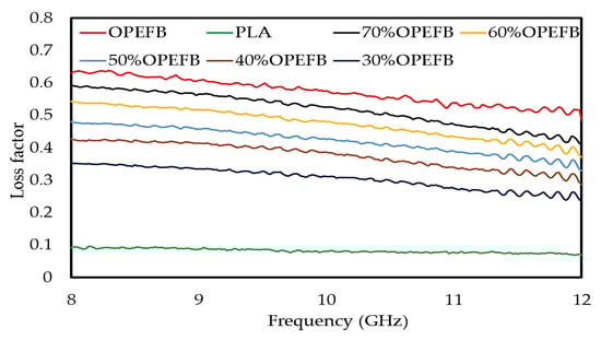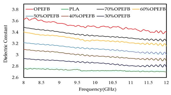 The complex permittivity (dielectric constant () and loss factor () of the OPEFB/PLA composites at different percentages of OPEFB filler was measured using the OEC technique. The fiber size of the OPEFB was chosen to be 200 μm to obtain the highest loss factor in order to increase the composite absorption property. The variation for the different OPEFB/PLA composites at the 8–12 GHz range is presented in Figure 8 and Figure 9 for the dielectric constant () and loss factor (), respectively. The and depend on the contributions of the orientation, interface, as well as electronic and atomic polarization in the materials []. The interfacial polarization arose due to the differences in polarization or conductivities of the matrix and fibers. Both the interfacial and the orientation polarization of a composite depend on the concentration of fibers. In mixture composites, the significant increase in and with an increase in OPEFB fiber loading was attributed to the increase in interfacial and orientation polarization resulting from the occurrence of polar categories of cellulose in natural fibers.