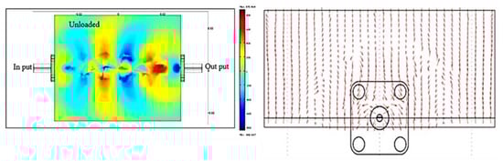 This section presents the electric field distribution surrounding the microstrip sensor for OPEFB/PLA composites shown in Figure 10 and Figure 11 obtained from FEM simulations. The arrows indicate the direction of the field vector from the positive charge to the negative charge. Collectively, the arrows form the overall shape of the field vector surrounding the sensor which is represented with the bold line. It should be noted, however, that the bold line does not represent the strength of the electric field but only serves to show the overall shape of the electric field. The electric field is a function of many parameters, including frequency, permittivity, and permeability of the surrounding material [,]. Figure 10 illustrates the electric field distribution at the unloaded microstrip (without sample), showing that most of the uniform field distribution of the electric fields converged at the top of the conducting strip.