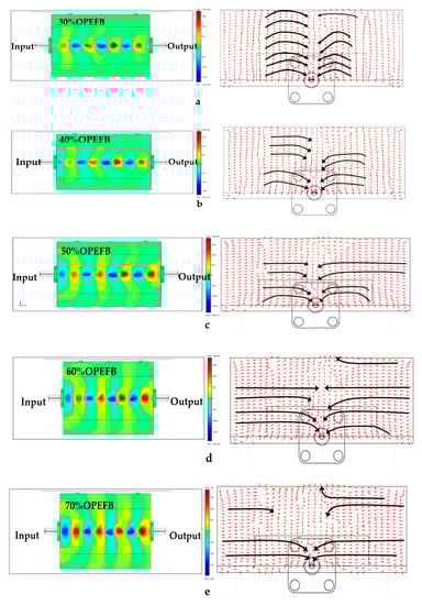 Electric field distribution and intensity plot for the different OPEFB/PLA composites (a) 30 wt%, (b) 40 wt%, (c) 50 wt%, (d) 60 wt%, and (e) 70 wt% of OPEFB.
