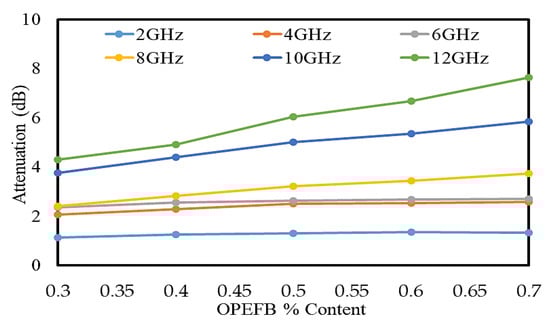 The calculated results showed that the attenuation of the OPEFB/PLA composites increases as the filler content increases. This confirms the proportional relationship between the attenuation outcome of the OPEFB/PLA composites and the filler composition. Figure 12 illustrates that the lowest attenuation value was calculated for the 30 wt% OPEFB particle filler, whereas the highest attenuation was calculated for the 70 wt% OPEFB particle filler. It is inferred from the results that the attenuation of OPEFB/PLA composites with different wt% of OPEFB increased with increase of the OPEFB filler and frequency. An addition of OPEFB composition was found to enhance the microwave properties of the OPEFB/PLA composites from a low loss material to a high loss material suitable for microwave attenuation. For the 30 wt% OPEFB particle filler, the attenuation at 2 GHz is 1 dB, the attenuation continued to increase to 4.456 dB as the frequency increases to 12 GHz. The attenuation trend did not change with the (40, 50, 60, and 70) wt% OPEFB particles filler at (2, 4, 6, 8, 10, and 12) GHz, respectively. The 40 wt% OPEFB/PLA composites have an attenuation of 1.182 dB at 2 GHz, which increased to 2.201 dB at 4 GHz, 2.352 dB at 6 GHz, 2.813 dB at 8 GHz, 4.213 dB at 10 GHz, and 4.987 dB at 12 GHz. The attenuation for the 70 wt% OPEFB filler at 2 GHz is 1.250 dB, at 4 GHz is 2.511 dB, at 6 GHz is 2.782 dB, at 8 GHz is 3.821 dB, at 10 GHz is 5.831 dB, and at 12 GHz the attenuation is 7.735 dB.
