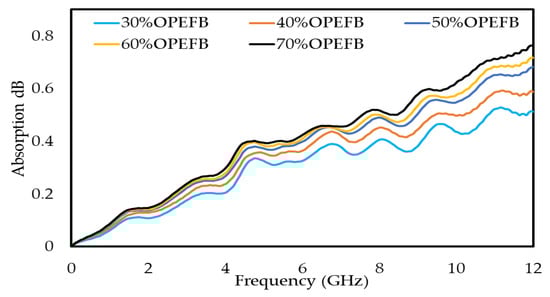 For OPEFB/PLA composites, the values of absorption loss at 8 GHz are (0.407, 0.452, 0.489, 0.499, and 0.515) dB for (30, 40, 50, 60, and 70) wt% OPEFB, respectively. The magnitudes of absorption loss at 12 GHz are (0.512, 0.587, 0.683, 0.718, and 0.763) dB for (30, 40, 50, 60, and 70) wt% OPEFB, respectively. The results show that the absorption loss increased with increasing frequency and percentage of the filler, as shown in Figure 13.