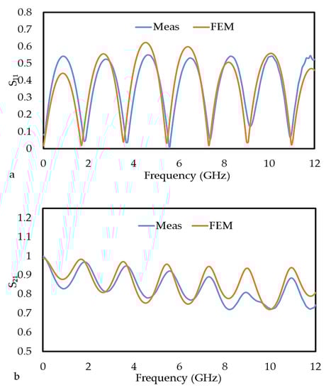 Note that the mean relative errors of S21 are calculated by replacing S11 with S21 in Equation (6). The mean relative errors between the measured and FEM values for S11 and S21 were 0.478 and 0.049, as listed in Table 3. The high error in S11 was due to the effect of multiple reflections not considered in the FEM simulation, which usually requires a large number of small meshes at the interface between the microstrip and the coaxial cable.