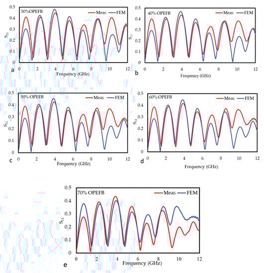 Variation in the magnitude of S11 for the different OPEFB/PLA composites (a) 30 wt%, (b) 40 wt%, (c) 50 wt%, (d) 60 wt%, and (e) 70 wt% OPEFB for both the measurement and FEM simulation.